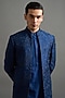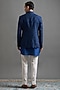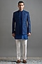 Featuring a royal blue jacket in dupion base with threadwork. It is paired with a kurta and ivory trousers. Accentuate it with mojaris for a wedding, engagement or sangeet ceremony.