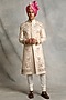 Featuring a sheer pink sherwani in raw silk base with embroidery. It is paired with contrasting off-white pajama pants and a kurta.