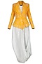Featuring a mustard jacket in murshidabad silk base with dadka pati embroidery. It is paired with a matching blush blue draped kurta and churidar pants in cotton lycra base.