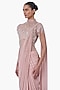 Featuring a blush pink gown saree in georgette and net base with a high-neck embroidered yoke and pleated drape. Accentuate it with sculpted metallic earrings, a statement cuff bracelet, and a structured mini bag for a stylish ensemble, ideal for cocktail receptions, formal galas or upscale evening events