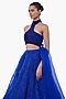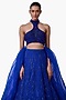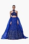 Featuring an electric blue lehenga in net base with fluid paneled detailing. It is paired with a sculpted blouse having a halter neckline and embellishment, including a dupatta. Accentuate it with statement chandelier or diamond earrings, an embellished clutch and strappy metallic heels for a graceful ensemble, ideal for engagement ceremonies, sangeet nights, or elegant evening celebrations.
