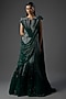 The ravishing emerald green sculpted lehenga saree by Gaurav Gupta is a masterpiece crafted from woven rayon georgette. This enchanting piece features intricate detailing that elevates your evening cocktail look. Embrace the night in style with dazzling silver jewellery, sleek stilettos, and a chic clutch to complete your glamorous ensemble.