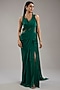 This striking emerald green gown saree is crafted in woven silk chiffon. It showcases an asymmetrical neckline, artistic cut-outs, sequin embellishments, and a thigh-high slit, making it perfect for high-glam occasions.