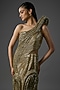 The lustrous, gold sculpted one-shoulder gown by Gaurav Gupta is crafted from polyester sequins that shimmer beautifully. The intricate detailing adds an alluring touch that elevates your evening cocktail look. Embrace the night in style with dazzling, bold jewellery and heels to complete your glamorous ensemble.