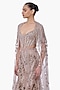 Featuring a haze champagne mermaid lehenga in net base with crystal embroidery. It is paired with a structured corset bustier and an attached sheer cape. Accentuate it with statement crystal or diamond drop earrings, a sleek embellished clutch, and strappy heels for a stylish ensemble, ideal for cocktail evenings, reception parties or glamorous celebrations.
