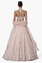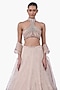 Featuring a haze champagne flared lehenga in net base. It is paired with a sculpted blouse having a halter neckline and embellishment, including a dupatta. Accentuate it with statement chandelier or diamond earrings, an embellished clutch and strappy metallic heels for a graceful ensemble, ideal for engagement ceremonies, sangeet nights, or elegant evening celebrations.
