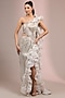 Gaurav Gupta?s Ivory Gown shimmers in rayon georgette, elevated with striking gold sculpted detailing. The intricate craftsmanship adds a touch of sophistication, making it ideal for cocktail soirees. Bold jewellery complements its dramatic flair. Finish with heels for a truly glamorous ensemble.