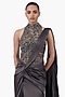Featuring an ivory grey draped gown saree in satin base with an embellished high-neckline and an asymmetrical drape. Accentuate it with sculpted metallic earrings, a statement cuff bracelet, and a structured mini bag for a stylish ensemble, ideal for cocktail receptions, formal galas or upscale evening events