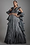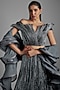 This lava grey embellished lehenga set crafted in rayon georgette base with intricate sequins and beadwork, paired with a structured blouse and a dramatic ruffle dupatta cascading at the sides. The ensemble blends grandeur with modern couture detailing, making it a statement outfit.