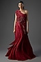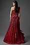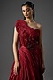Gaurav Gupta presents a Lava Red Gown in silk crepe and elastane base, designed in a sculptural one-shoulder style. The surface is richly adorned with intricate sequin work for a high-impact look. Fluid drapes and a flared hemline enhance its dramatic appeal. Style it with statement jewellery for a show-stopping evening ensemble.
