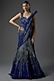 This Midnight Blue Gown by Gaurav Gupta is crafted in shimmering rayon georgette, designed with lustrous gold sculpted accents. Intricate detailing enhances its allure, making it a perfect pick for evening cocktails. Pair it with bold jewellery for a statement finish. Complete the look with sleek heels to exude effortless glamour.