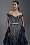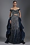 This midnight blue embellished lehenga set crafted in rayon georgette base with intricate sequins and beadwork, paired with a structured off-shoulder blouse and a dramatic ruffle dupatta. The ensemble blends grandeur with modern couture detailing, making it a statement outfit.