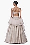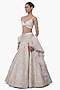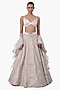 Featuring a sage gold lehenga in stretch satin base with embroidery. It is paired with a crossover blouse and an organza layered ruffle dupatta. Accentuate it with statement chandelier or diamond earrings, an embellished clutch and strappy metallic heels for a graceful ensemble, ideal for engagement ceremonies, sangeet nights, or elegant evening celebrations.