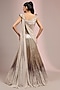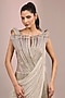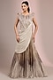 The illuminating, sage gold sculpted lehenga saree by Gaurav Gupta is crafted from rayon georgette woven. The intricate detailing adds an alluring touch that elevates your evening cocktail look. Embrace the night in style with dazzling, bold jewellery and heels to complete your glamorous ensemble.