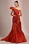 This Sunset Orange Gown by Gaurav Gupta is crafted in shimmering polyester crepe, designed with lustrous gold sculpted accents. Intricate detailing enhances its allure, making it a perfect pick for evening cocktails. Pair it with bold jewellery for a statement finish. Complete the look with sleek heels to exude effortless glamour.