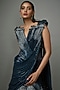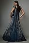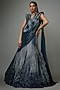 The Ravishing Teal Sapphire sculpted lehenga saree by Gaurav Gupta is a masterpiece crafted from woven rayon georgette. This enchanting piece features intricate detailing that elevates your evening cocktail look. Embrace the night in style with dazzling silver jewellery, sleek stilettos, and a chic clutch to complete your glamorous ensemble.