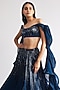 This Teal Sapphire Lehenga Set crafted in rayon georgette base with intricate sequins work, paired with a structured off-shoulder blouse having an attached drape detail. The ensemble blends grandeur with modern couture detailing, making it a statement outfit.
