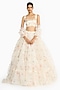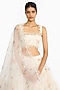 Featuring a blue and peach lehenga in silk organza base with floral print. It is paired with a ruffled blouse and dupatta. Style with polki jewellery, soft curls, and embellished heels for weddings, engagements, or festive events.