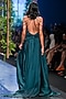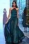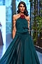 Featuring a bottle green gown in viskolyk organza base with embroidery, a halter neckline, and shoulder strings.