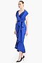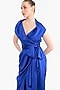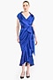 Gauri and Nainika features an electric blue wrap-around midi dress in satin base with a shawl collar and ruffled hemline. Style it with bold earrings, metallic heels and a statement clutch for a striking look, perfect for parties or night events.