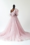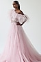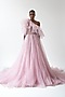 Featuring a light pink one-shoulder gown in dotted organza base with cold-shoulder sleeves and ruffles.