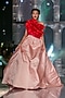 Featuring a light pink flared gown in organza and duchess satin base. It has one shoulder neckline.
