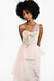 Gauri and Nainika features a light pink pencil dress in tulle base with a corset bodice and crystal embellishments at the waist. It is paired with an one-shoulder drape. Style it with pearl stud earrings, block heels and a statement clutch for a striking look, perfect for cocktail evenings, receptions or festive occasions