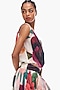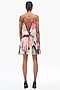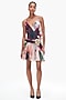 Featuring a multi-colored mini dress in crinkled chiffon base with an overlapping neckline, print, and embroidery.