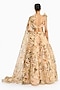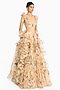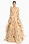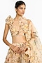 Featuring a peach lehenga in silk organza base with chinoiserie print. It is paired with a blouse having floral details and ruffled dupatta. Style with polki jewelry, soft curls, and embellished heels for weddings, engagements, or festive events.