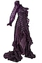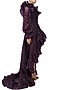 Featuring a plum one shoulder overlapping gown in organza base with stripes print all over and long pouf sleeves. It has ruffle panels on the neckline, sleeves and hem.