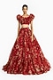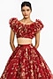 Featuring a red lehenga in silk organza base with forest print. It is paired with a ruffled blouse. Style with polki jewellery, soft curls, and embellished heels for weddings, engagements, or festive events.