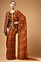Featuring a brown pre-draped saree in organza base with print. It is paired with a blouse having power fall sleeves. Accentuate it with statement jewellery, block heels and a bag for weddings, engagement or sangeet ceremonies.