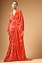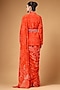 Featuring an orange pre-draped saree in silk crepe base with print. It is paired with a jacket having a structured collar and a hand embroidered belt. Accentuate it with statement jewellery, block heels and a bag for weddings, cocktail or sangeet ceremonies.