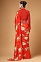 Featuring a red pre-draped saree in silk crepe base with floral print. It is paired with a jacket having a short collar. Accentuate it with statement jewellery, block heels and a bag for weddings, engagement or sangeet ceremonies.