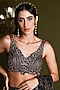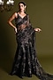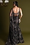Featuring a black saree in nylon and viscose base with gold foil, crystal and lace details. It is paired with an embroidered blouse and an underskirt. Accentuate it with statement jewellery and heels for festive occasions.