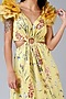 Featuring a pastel yellow gown in polyester, nylon, and viscose base with waist cut-outs, ruffled sleeves, and multi-colored floral print.