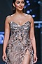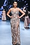 Featuring a peach and rose gold gown in nylon and polyester base with gems, sequins, beads and tassel embroidery, including a side slit. Accentuate it with statement jewellery and heels for any special event.