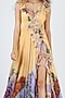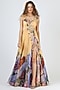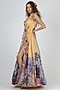 Featuring a yellow gown in polyester, viscose and nylon base with floral print, a ruched bodice, handcrafted floral applique embroidery and a thigh high slit.
