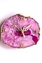 Presenting a handcrafted pink table clock made from agate stones; this timepiece makes for a beautiful housewarming gift or work of art for any home. It has gold hands and roman numbers that make this piece unique.