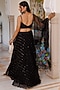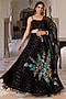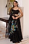Featuring a black lehenga in chiffon base. It is paired with a crepe blouse and an organza dupatta having hand painting and mukaish work. Accentuate it with statement jewellery, a potli bag and block heels for wedding, haldi or sangeet ceremony.