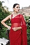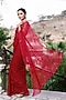 Featuring a cherry red saree in chiffon base with mukaish hand embroidery. It is paired with a crepe blouse and a cotton underskirt. Perfect for weddings or day events ceremonies. The timeless design of this saree will add a festive touch to any occasion.