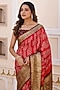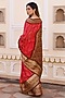 Featuring a red saree in gajji silk base with handwoven zari pallu. It is paired with an unstitched blouse fabric. Accentuate it with oxidised jewellery, a statement clutch bag and block heels for festive occasions, wedding or sangeet ceremony.