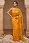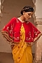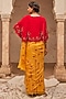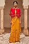 Featuring a yellow saree in chiffon base with hand embroidery. It is paired with a red silk cape having pearl and sequins embellishments, including a crepe stitched blouse and a stitched underskirt. Accentuate it with statement jewellery and heels for a haldi ceremony or weddings.