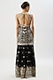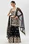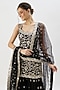Featuring a black kurta in tussar base with mirror and floral embroidery. It is paired with georgette flowy sharara pants and a net tikki dupatta. Complete your festive or haldi look with dangler earrings and elegant heels.