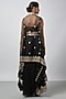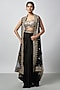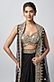 Featuring a black cape in organza base with mirror work and embroidery. It is paired with a tussar embroidered blouse and crepe draped skirt. Accentuate it with statement jewellery and heels for a wedding, sangeet or engagement ceremony.