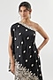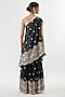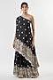 Featuring a black asymmetric kurta in tussar base with mirror embroidery. It is paired with sharara pants. Complete your festive or haldi look with dangler earrings and elegant heels.