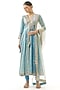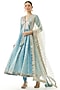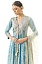 Featuring a blue anarkali in cotton silk base with a deep v-neckline, gota patti and thread hand embroidery. It is paired with lycra churidar pants and an embroidered net tikki dupatta. Accentuate it with silver jewellery and embellished heels for a festive occasion or sangeet ceremony.