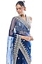 Featuring a blue saree in organza base with embroidery and mirror work. It is paired with a halter-neck tussar blouse having embroidery. Accentuate it with statement chandbali earrings and embellished heels for a refined ensemble, ideal for sangeet ceremonies or festive occasions.