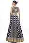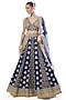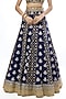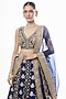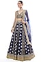 Featuring a blue lehenga in tussar base with embroidery and motifs. It is paired with an embroidered blouse having a plunging neckline and an organza dupatta. Accentuate it with statement chandbali earrings and an embellished heels for a refined ensemble, ideal for weddings or sangeet ceremonies.