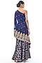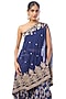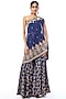 Featuring a blue one-shoulder draped top in georgette base with motif embroidery. It is paired with tussar sharara pants. Accentuate it with kundan polki jewellery and block heels for a wedding or sangeet ceremony.